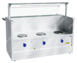 Мармит Abat ПМЭС-70Х-01 используется на предприятиях общественного питания и торговли для поддержания в горячем состоянии наплитной посуды с первыми блюдами и их раздачи потребителю. Модель оснащена 3 круглыми конфорками и 3 переключателями, позволяющими регулировать их температуру. Корпус и панели выполнены из нержавеющей стали.